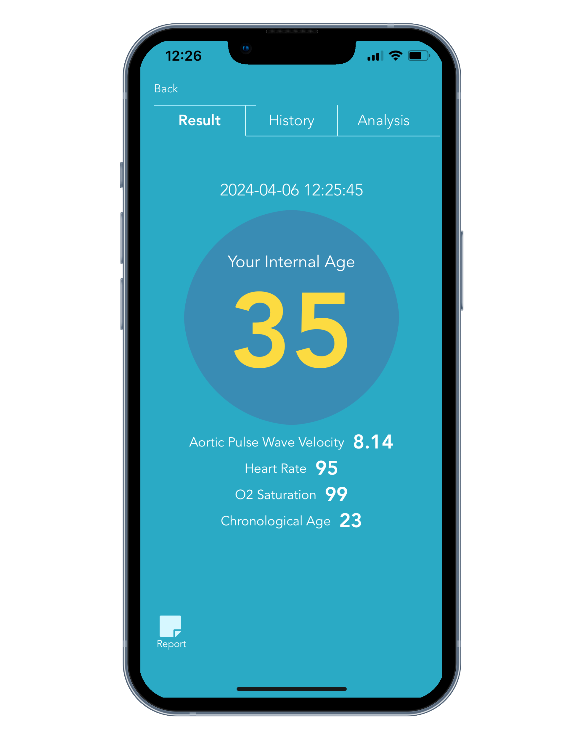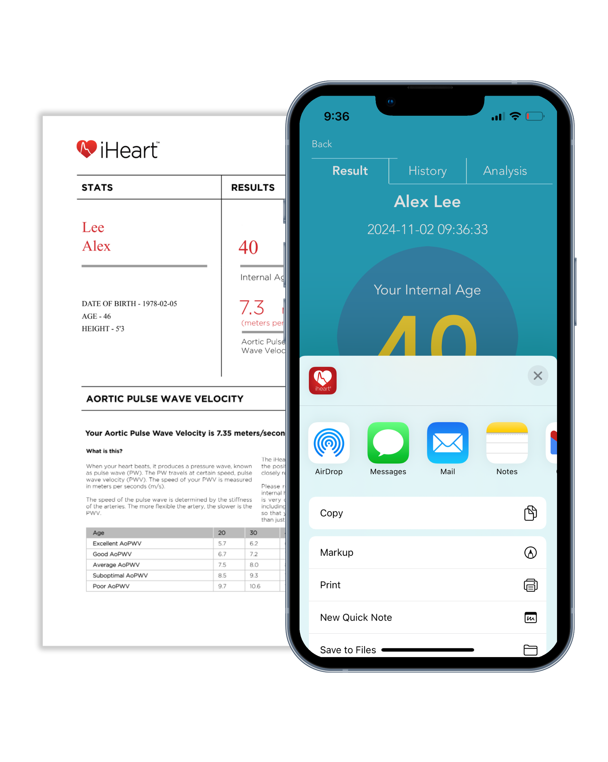 The iHeart Internal Age app analyzes the fingertip arterial pulse signal to measure Aortic Stiffness and calculate Aortic PWV. The app then provides an Internal Age score based on the correlation of aortic stiffness with age.